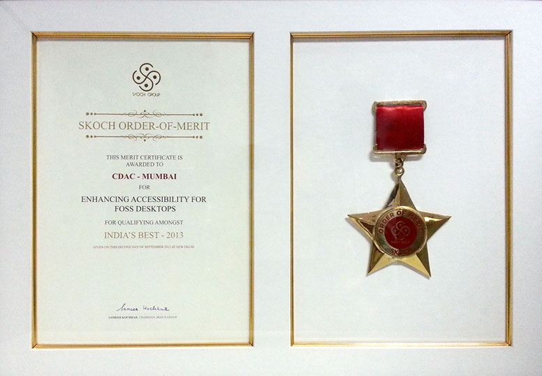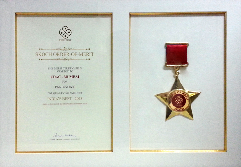 These medals along with certificates were conferred to CDAC Mumbai in an awards ceremony held at 33rd SKOCH Summit during September 2-3, 2013 in New Delhi. SKOCH awards from SKOCH Group are hailed as one of the highest independently instituted civilian honours in the country and considered as independent benchmarks for best practices in India in the fields of governance, finance, banking, technology, corporate citizenship, economics and inclusive growth.