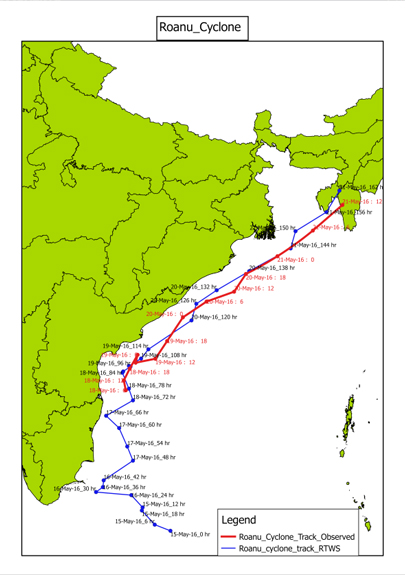 "Anuman" (http://rtws.cesgroup.in/) comprises daily operational weather products in real time. It provides high-resolution (12x4 km grids) weather simulations over Indian sub-continent along with daily and 6-hourly weather forecasts over nearly 50,000 locations. Real time operational forecasts have been carried out daily using C-DAC’s PARAM Yuva-II. Cyclone Roanu was formed on May 17, 2016 and dissipated on May 23, 2016. The case was simulated with Real Time Weather System (RTWS) data. The track forecast was simulated well by the model. Outputs from Anuman are also being used to provide micro climatic data which is very useful for farmers.