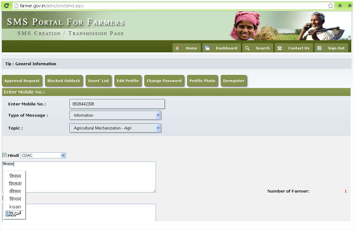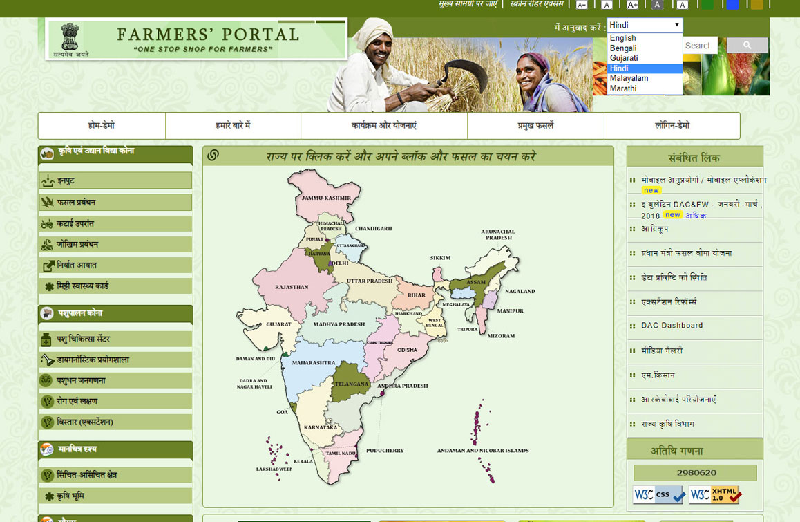 Farmers' Portal is one stop shop for meeting all informational needs relating to Agriculture, Animal Husbandry and Fisheries sectors production, sale/storage of an Indian farmer. Having information in Indian languages is beneficial for the farmer to understand the issue easily in their mother tongue.This has increase the reach of portal to remote corner of India. Translation Snippet for 6 languages is used by the portal to translate it content in Indian languages.