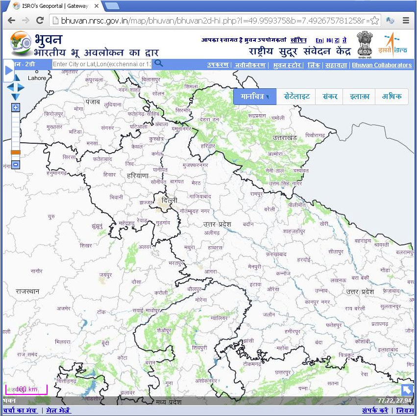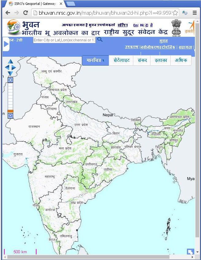 Bhuvan portal now has Hindi Support using Localisation services. Bhuvan portal of NRSC (National Remote Sensing Centre) of ISRO (Indian Space Research Organisation) under Department of Space,Government of India now has Hindi Support using Localisation services. The 2D map is currently made live from the Bhuvan portal.