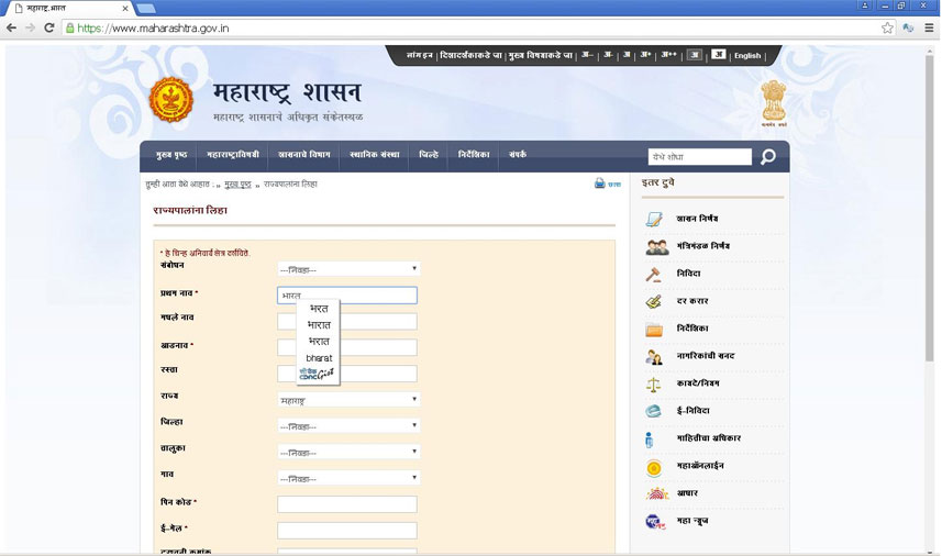 C-DAC has successfully integrated transliteration based typing for typing in Marathi in "Write to Governor" page.