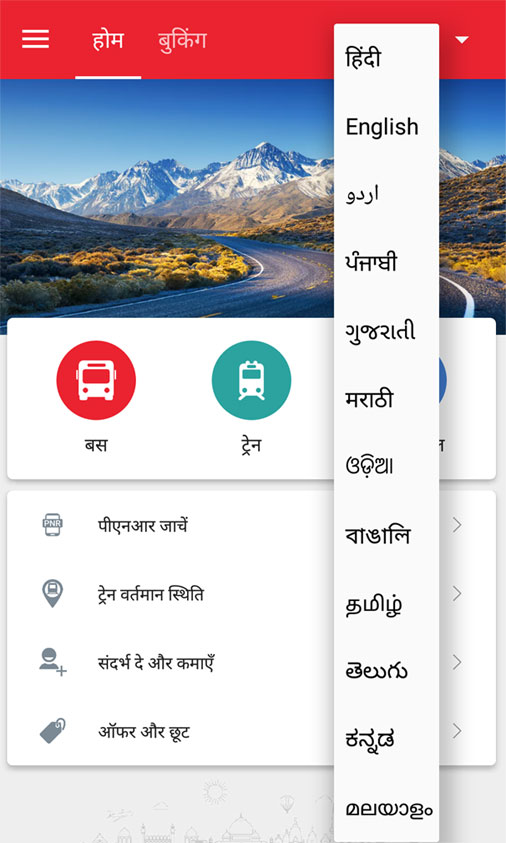 Yatra Mini Android App - Budget Hotel Booking module is localized in 11 Indian languages: English, Hindi, Tamil, Telugu, Kannada, Malayalam, Gujarati, Bengali, Punjabi, Urdu, Marathi and Odiya.