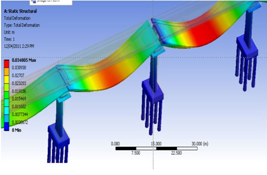 • The bridge is having two lanes with 7.5 m clear road width between the kerbs and footpath 1.5 m width on D/S. 8-span composite structures with pre-stressed concrete box and RCC piers provide continuity. Piers are supported on pile groups, each of which is RCC pile. The foundation data is composed of mainly medium to dense clayey sand. In addition, fractured amagdoidal basalt layers are present. The hard rock is located at 23 m to 25 m depth