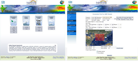 CES Group from last 20+ years has generated a range of simulated model outputs of meteorology, oceanography and air quality with huge database system which renders online images using high end technology. This online database “Saptarang” hosted on http://saptarang.cesgroup.in contains model outputs of global & regional atmospheric model, air quality model, ocean model, coupled atmospheric-ocean model developed by C-DAC and its numerous derived products. The team has ran different models related to Air Quality, Atmospheric and Ocean. This total data has now become in TB's. To save time of researchers and scientists they have provided this data for their research and study purposes. The concerned user can use this data for doing many type of activities like,