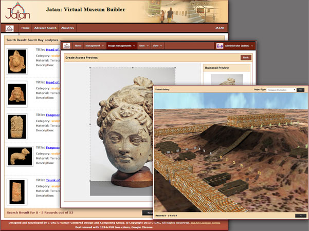 HCDC Group, C-DAC Pune has designed and developed JATAN: Virtual Museum Builder, which is a digital collection management system for Indian museums. It is a client server application with features such as image cropping, watermarking, unique numbering, management of digital objects with multimedia representations, Dublin core metadata compliance, collaborative framework for museum curators and historians, search and retrieval, access control for the portal, user administration, conservation reports, 3D virtual galleries and public access through web, mobile or touch screen kiosks. JATAN software is successfully deployed in ten national museums across India, as standardized by Ministry of Culture, Government of India. The list of national museums where JATAN has been deployed is as under-