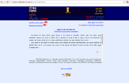 Realizing the immense potential of MT, the Department of Official Language, (DOL) Government of India, began actively funding such projects in following domains such as Personnel Administration, Finance, Agriculture, Small Scale Industries, Information Technology, Healthcare, Education and Banking domains. The project is called ‘MANTRA-Rajbhasha’ which is broadly being used in various ministries and official departments.