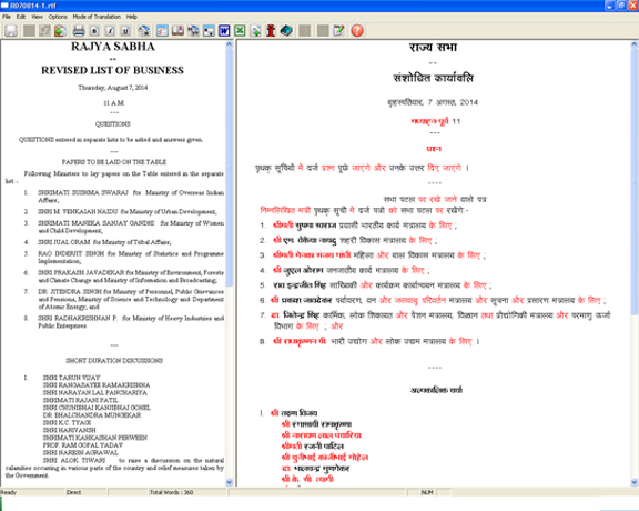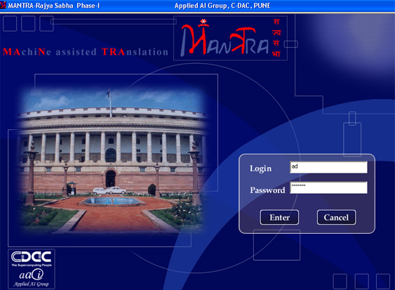 ‘MANTRA-Rajya Sabha’ was designed, developed and implemented on a computer assisted translation system for Rajya Sabha, Upper House of the Parliament. This system translates the daily proceedings of Rajya Sabha covering List of Business, Paper to be Laid, Parliamentary Bulletin Part I & II. The system is now able to translate letters and circulars such as appointment letters and transfers and is also capable of taking inputs from standard Word processing and DTP packages.