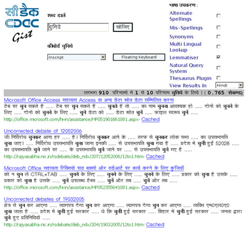 Intra word grammar is one of the major attribute of Indian Languages and so the user should be given the results which include the linguistic variants including suffixes of searched terms, like “चुने” ,”चुनकर”, ”चुनिये” etc.