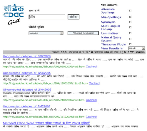 Like all languages, Indian languages also have their share of misspelled words. In Indian language some misspelled words are more prominently in use than their grammatically correct counter part. For example the word “जांच” is incorrect but is used more often than its correctly spelled form “जाँच”. This plug-in allows the user to cater the search results that contains the mis spelled form of the entered word as well.