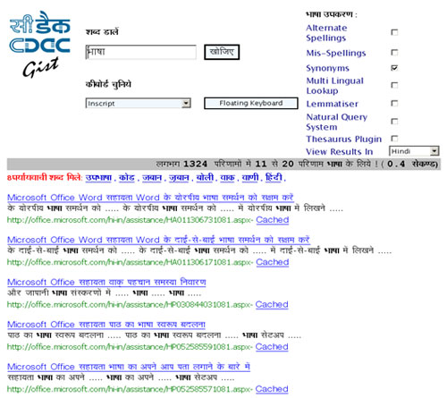 Because of their historical antecedents Indian languages are rich in vocabulary, with more than one synonym for a particular word. To ensure that synonums are trapped in the search net, the synonym suite provide the most common synonymic equivalents of the word thereby enriching the search capabilities. Look for भाषा and also see the most common synonyms for language: