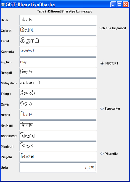 This tool enables typing in Hindi, Marathi, Gujarati, Tamil, Kannada, English, Bengali, Malayalam, Telugu, Oriya, Nepali, Konkani, Assamese, Manipuri, Punjabi and Urdu for Swing Applications. It supports widely used keyboard layouts viz. Phonetic, Inscript and Typewriter. It is based on the Input Method Framework. Any swing based application that runs on JRE 1.4 and above is capable of supporting typing using this tool