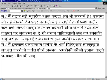 Web users who want to convert a page to their language can do so by using the browser based solutions. At the click of a button the English web page can be converted to various Indian languages like Devanagari, Tamil, Punjabi, etc at the client side. The conversion does not affect the layout or advertisementsof the page. Sample screen shots are shown below.
