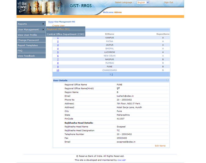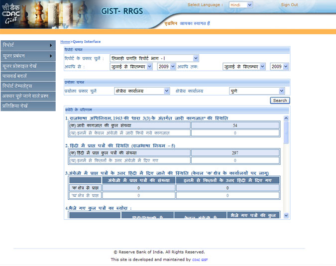 GIST Rajbhasha Report Generation Software (GIST - RRGS) is a unique web-based reporting system to cater to the requirements of Rajbhasha departments of nationalized banks, financial institutions, PSU's etc. in generating various organizational reports in compliance with statutory guidelines.