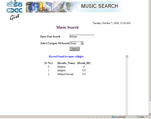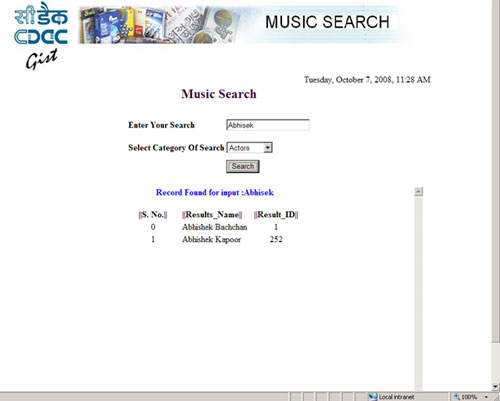 Music Search is a web based application, which simulates a Search Engine, in the Music Domain.The searching is classified into four categories, viz, Actors, Movie Title, Singer, Song Title.