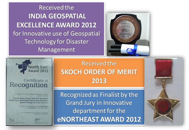 AWARDS & RECOGNITION The Flood Response System received the India Geospatial Excellence Award for the year 2012 in the India Geospatial Forum in the category of Innovative use of Geospatial technology for Disaster Management. FRS was also recognized as a Finalist in the Innovative Dept/ Public Sector Unit or Agency category by the Grand Jury of eNortheast Award & received the Certificate of Recognition for the year 2012. FRS also received the SKOCH Order-of-Merit in 2013.