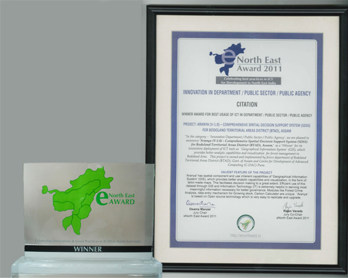 In recognition to the innovativeness of the product 'Aranya' was conferred the prestigious eNorth-East Award 2011 in the category of 'Innovative Department / PSU'. The award was handed over in the 2nd eNorth East Award Summit Digital Festival at the Regional Institute of e-Learning Information Technology (RIELIT), Kohima on the 25th of November, 2011.