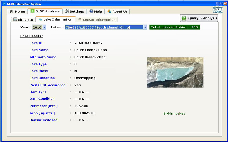 The GLOF Analysis Tool has three sub-tools: Lake Information, Simulation & the Sensor Information. The "Lake Information" tool gives basic information about the glacial lake selected by the user from the drop-down menu, such as, Lake Name, Lake Condition, etc. The satellite image of the glacial lake is shown on the right hand side.