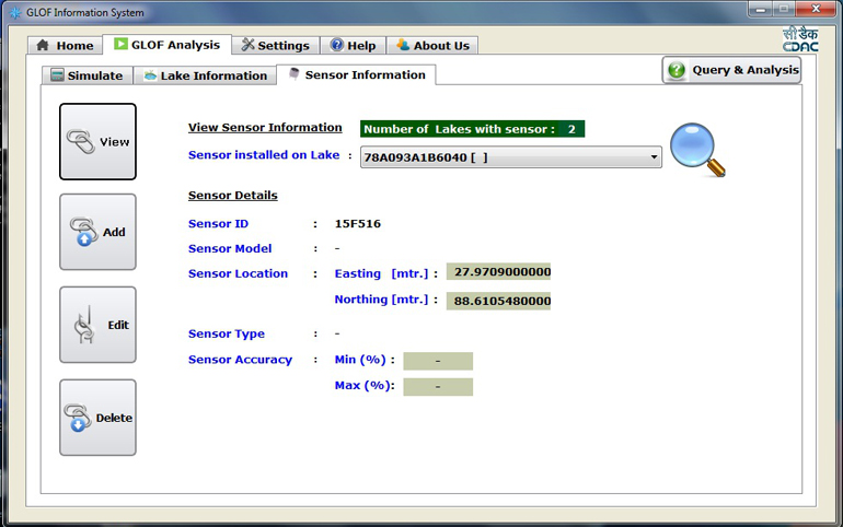 The Sensor Information tool gives basic information about the sensors deployed at the glacial lakes for monitoring water-levels. Each sensor has a Sensor ID linked to the Lake ID. The user may add information of new sensors when sensors are deployed on new glacial lakes in future or delete existing ones, in case if they are decommissioned.