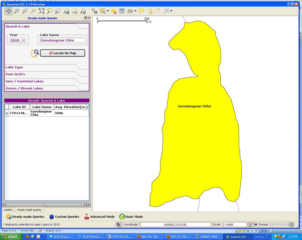 The Query tool gives the user three options based on his expertise or authority in using the system. The "Ready-made Queries" option is for user who wishes to know basic information about the glacial lake of interest on the GIS interface. The queries are tailor-made for users who do not have expertise in GIS. In this mode, only the basic functionalities such as zoom in/out, info tool, select feature, etc. are only available on the GIS interface.